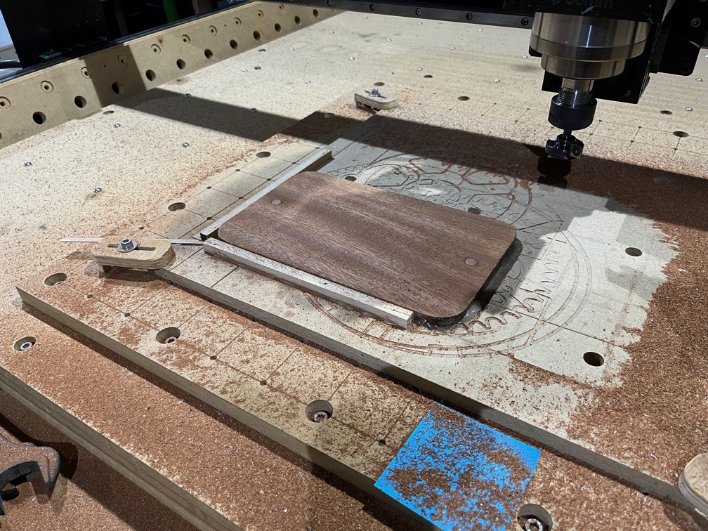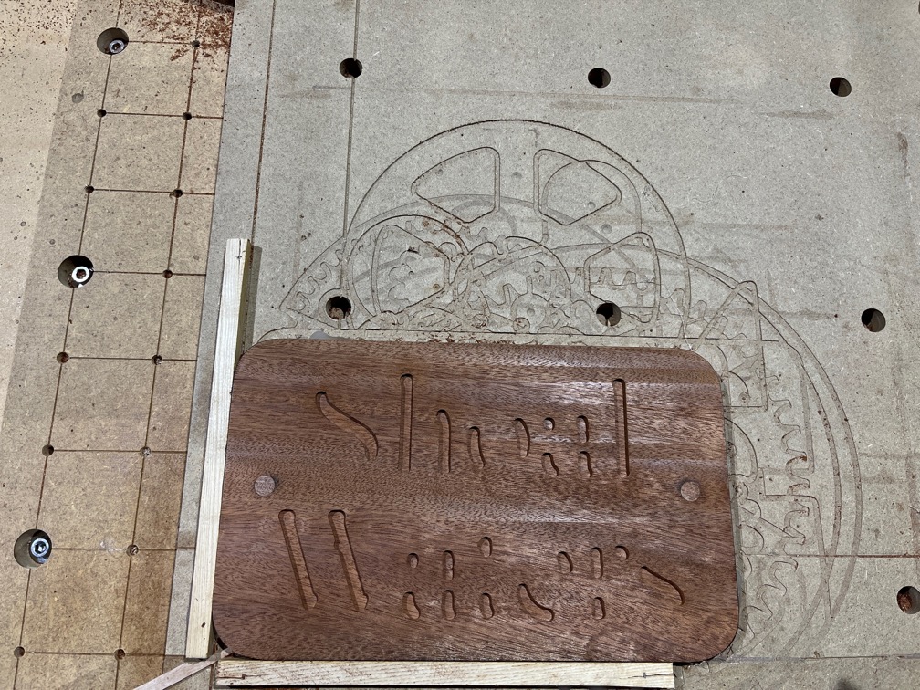 The old fixing holes were plugged and once the glue had dried sufficiently, the plugs were sanded flush. The board was then mounted on the CNC Router table and given a surface cut just deep enough to cover the entire surface.
