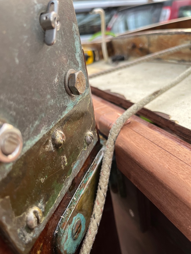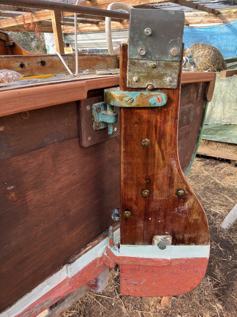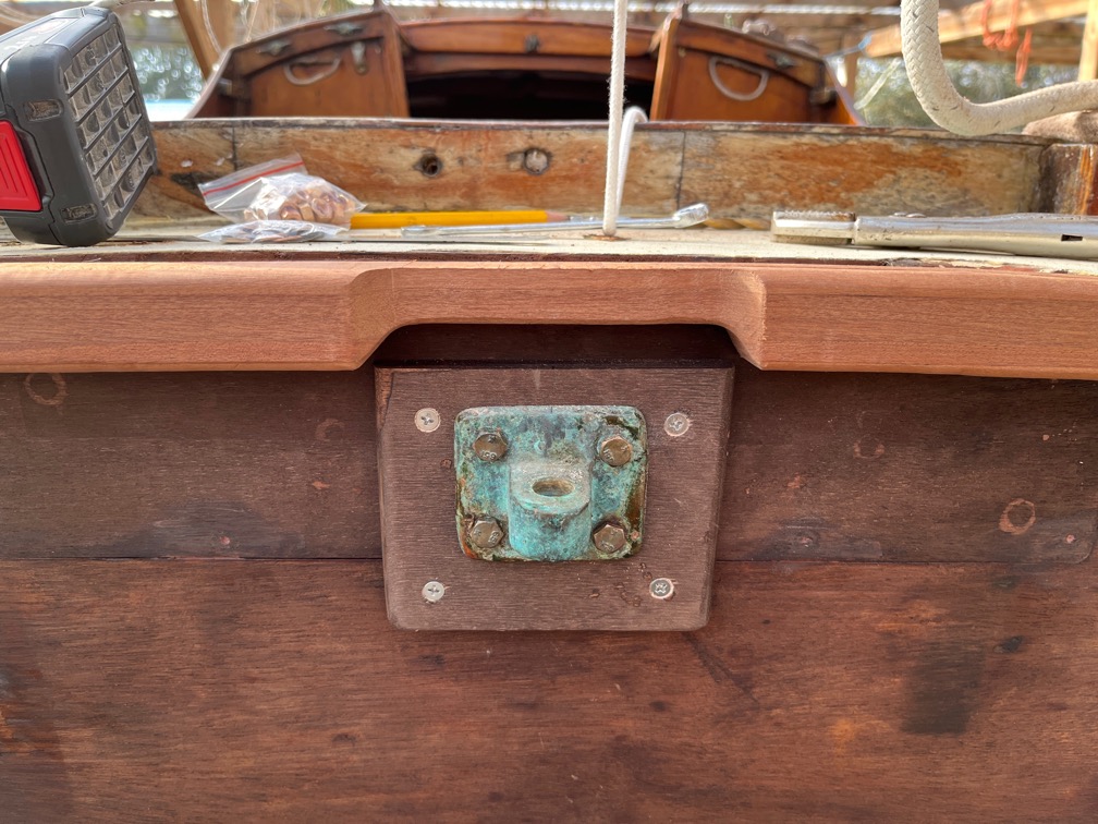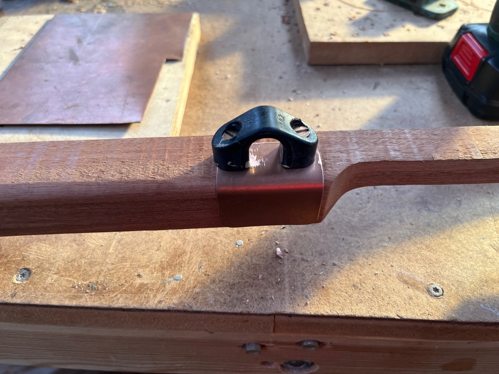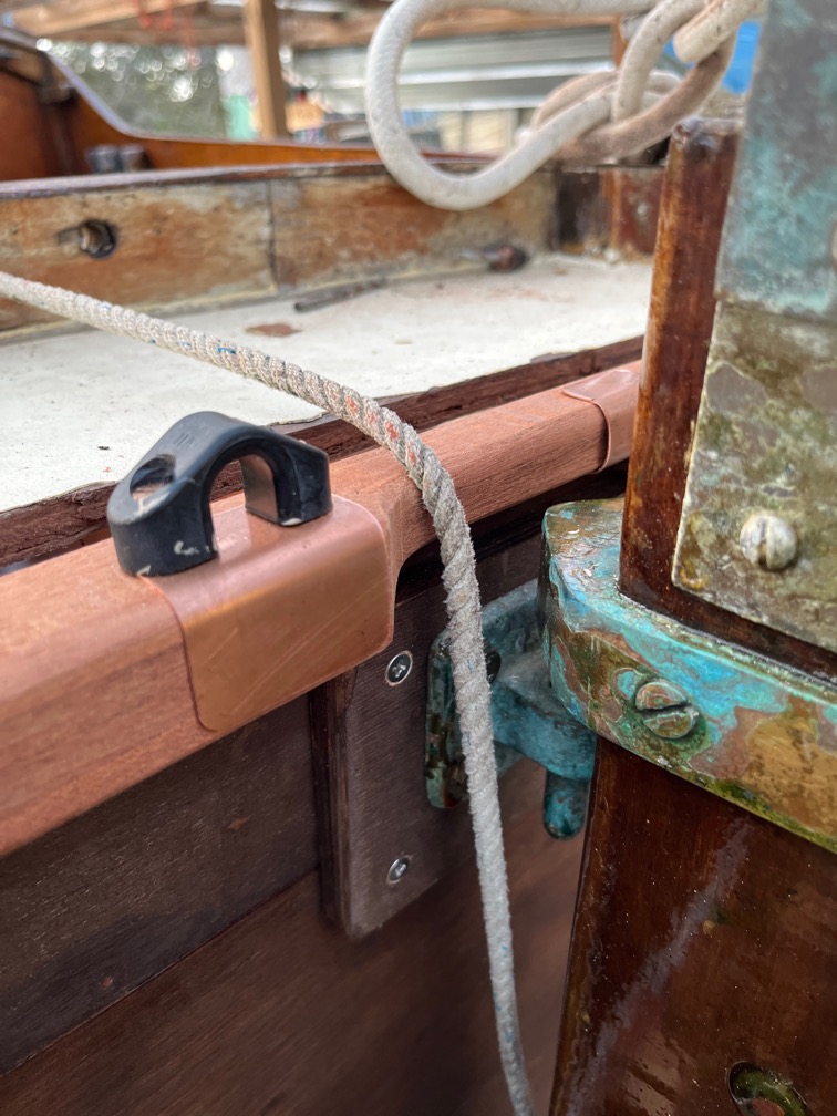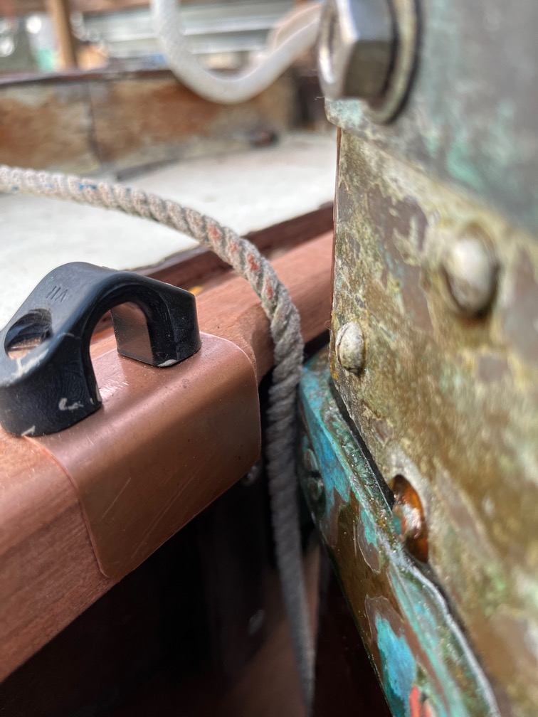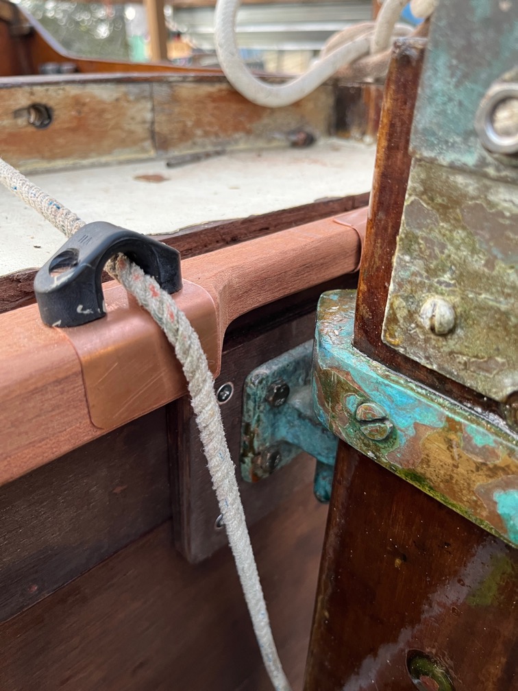 This replaces the screwed in eye that I believe contributed to the rot in the transom. I’ve used a nylon guide and a piece of copper folded over the strake. The purpose of the original eye and now this guide is to pull the downhaul line aside from the rudder stock so that it does not foul the rudder stock itself. The uphaul will just need a piece of copper over the strake as it is already off to one side.