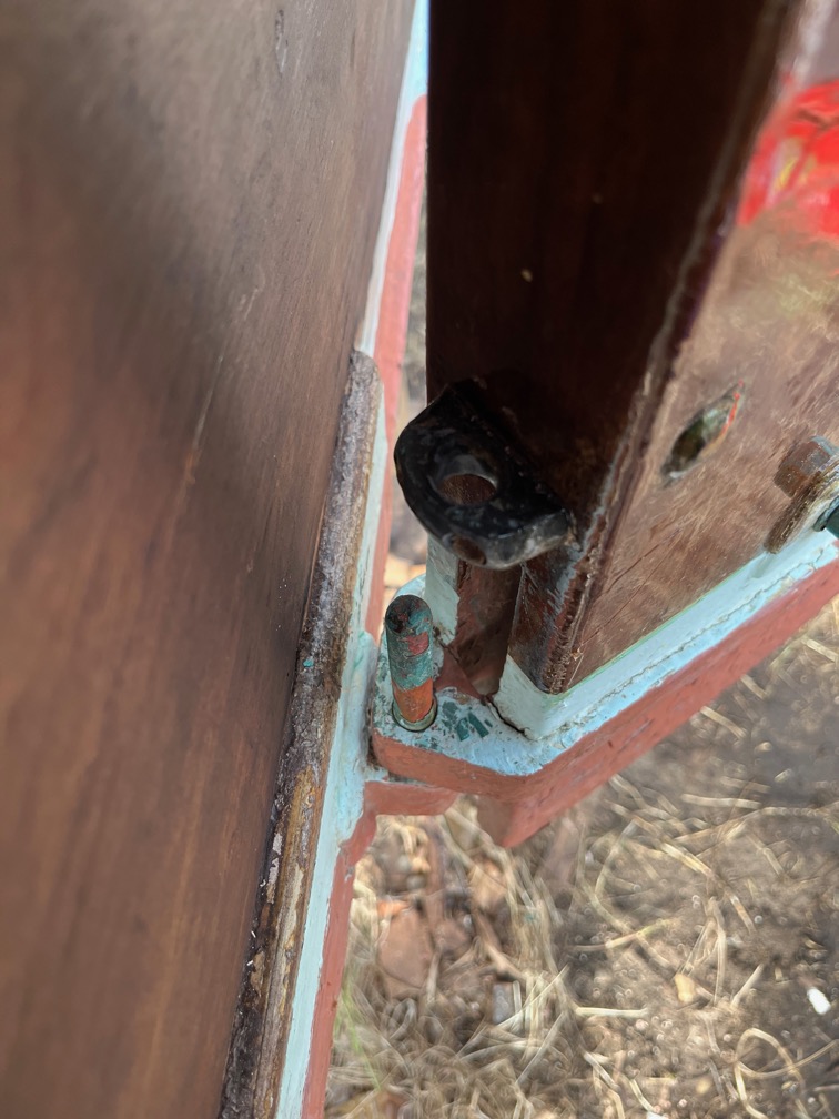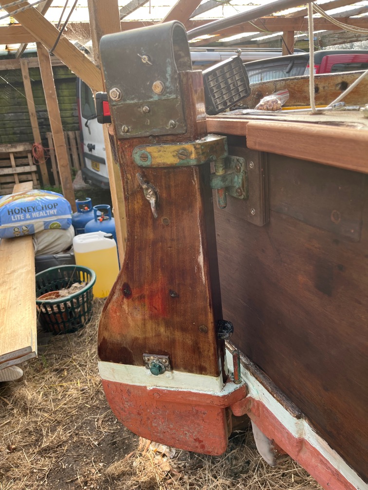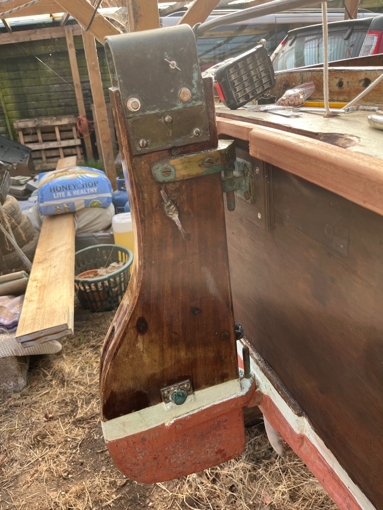 …in both directions. You will notice that there is quite a large gap between the top surface of the gudgeon and the bottom surface of the pintle. At some point a piece of copper, I think, has been wrapped around the upper part of the pin and it no longer goes down into the hole in the gudgeon, presumably to stop the two from rattling after being worn away after years of use. I am loath to remove the extra copper bit, so instead I will get some copper washers to fill in the gap between the two faces such that the rudder is resting on both of its fitting instead of the bottom one only which is what is happening now.