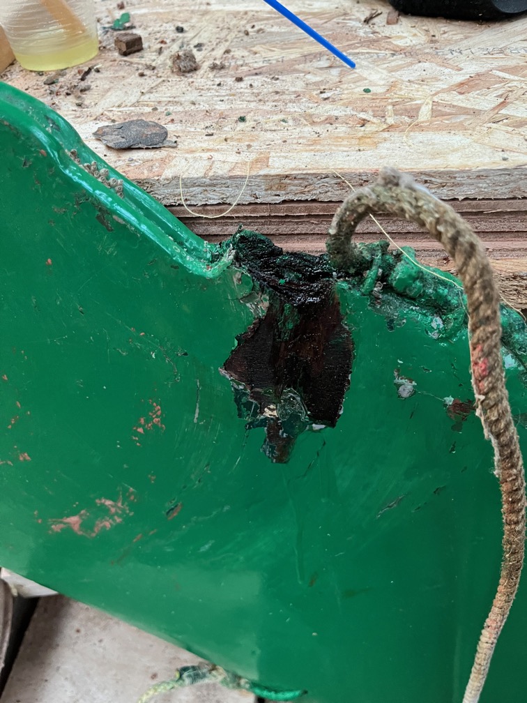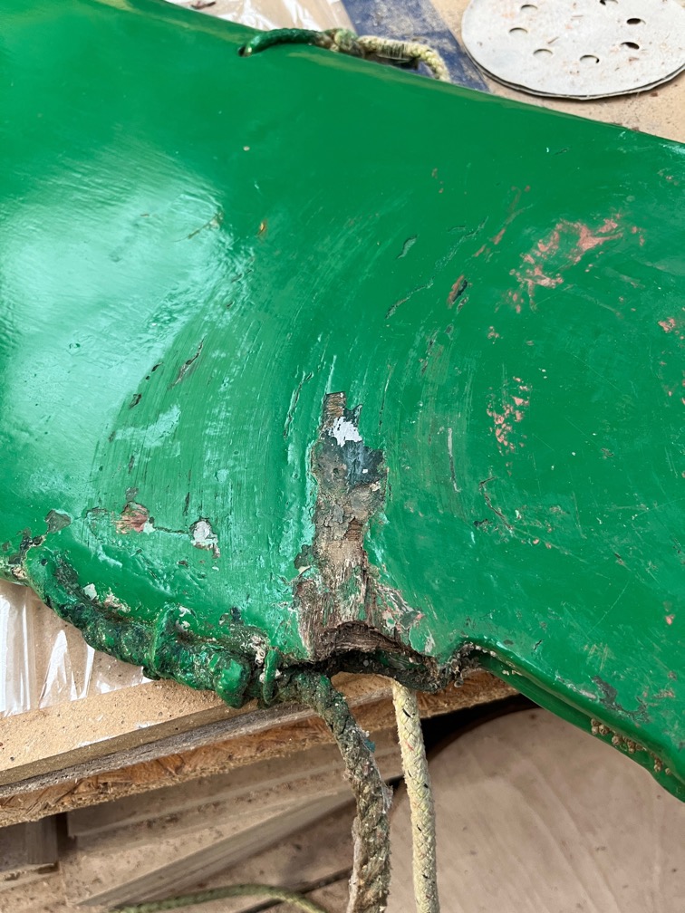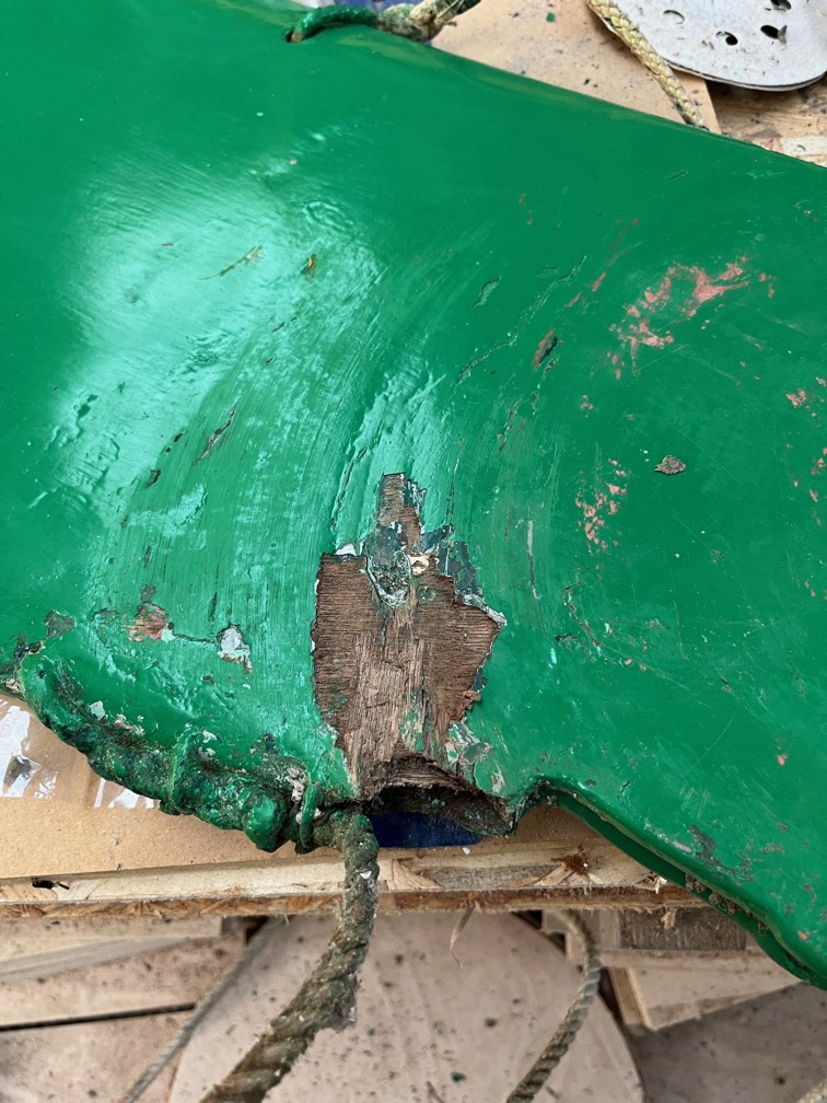 The bad news is that I found more rot, this time in the rudder blade. A group of barnacles, or is it a colony, on the inside of the rudder stock have worn away the layers of paint and exposed the plywood of the blade and over time, rot has set in.