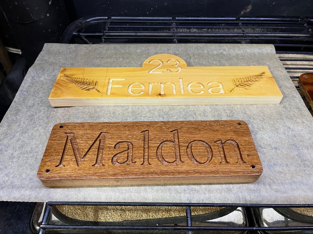 I had two signs that needed to be coated with epoxy to prevent pigmented epoxy bleeding into the grain later, so that was the first task. One of the signs is the Maldon name plate and the other is a house sign commissioned by a customer.