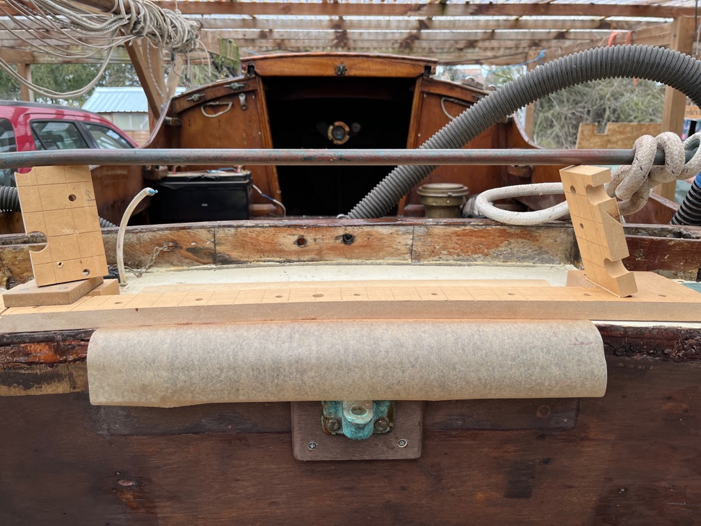 The graving piece was put into position, epoxy used to fill the semicircular cut out in the aft deck, the area covered with greaseproof paper and the whole lot pressed down using the router template from before.