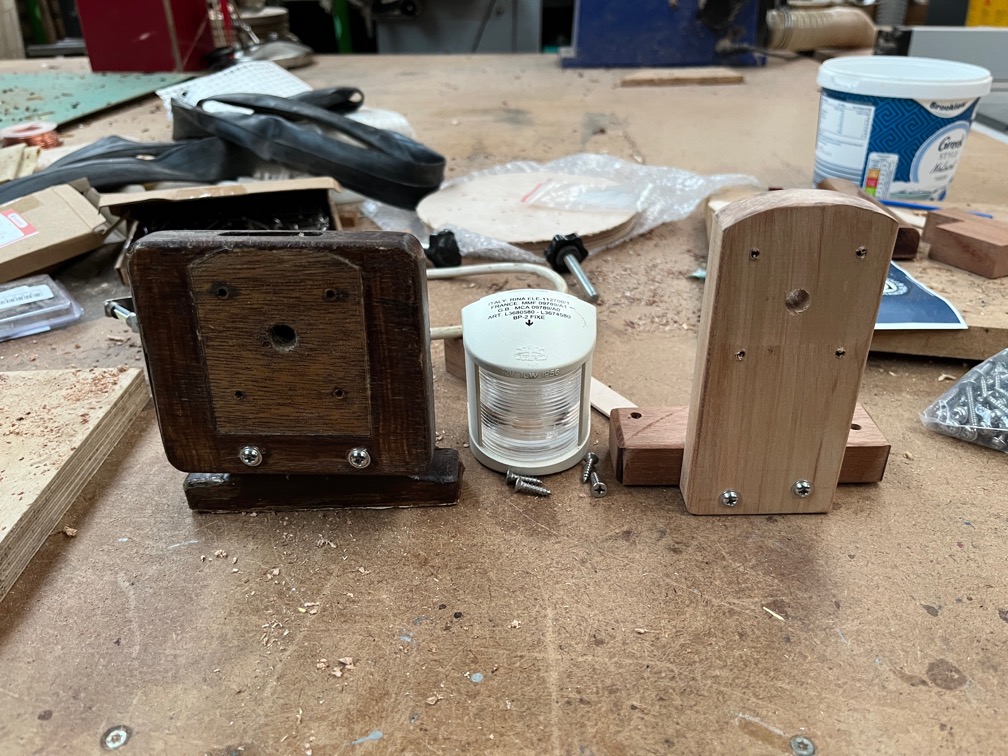Here are the old (left) and the new mounts. The large base for the original mount was large because the original aft light was also large. A huge copper navigation light that must have been six to eight inches tall.