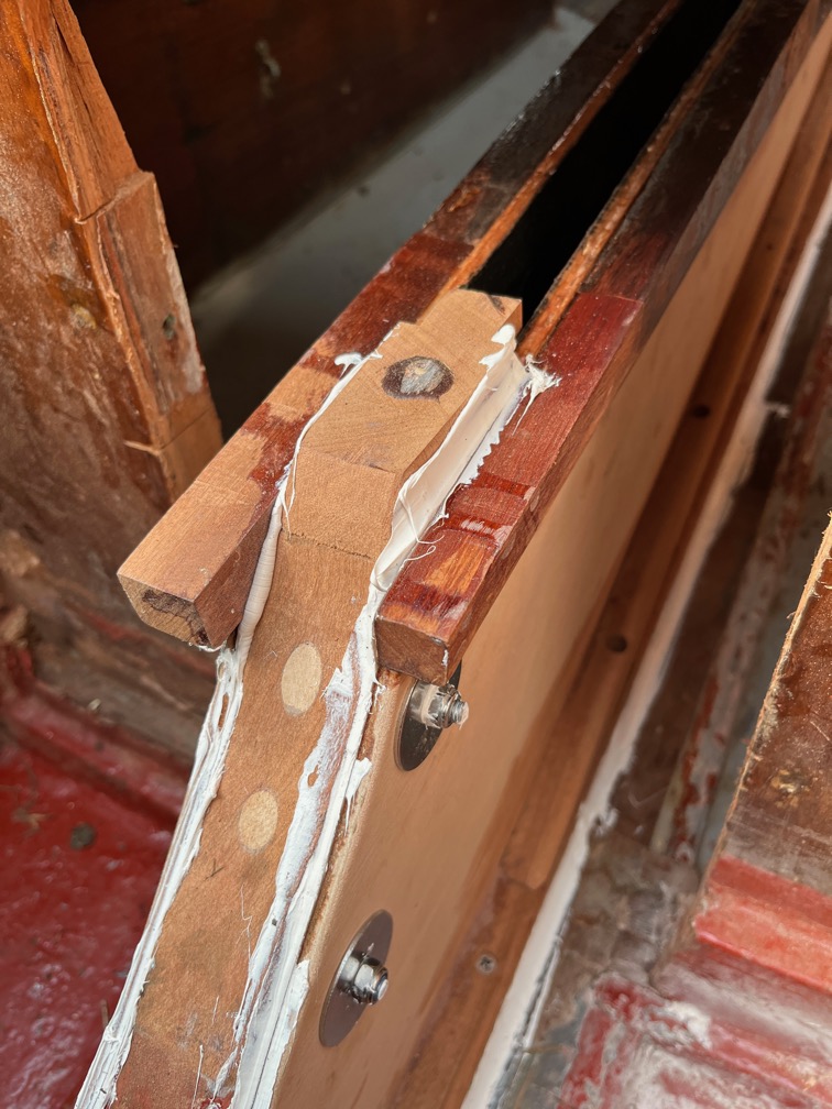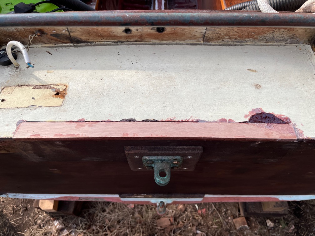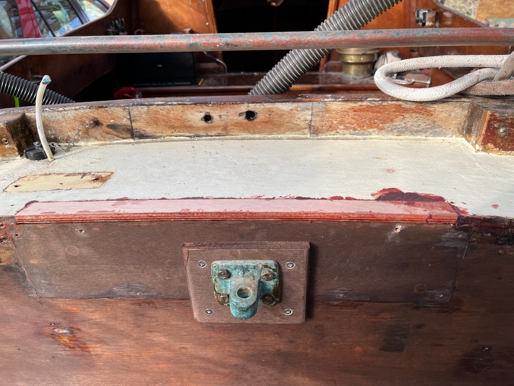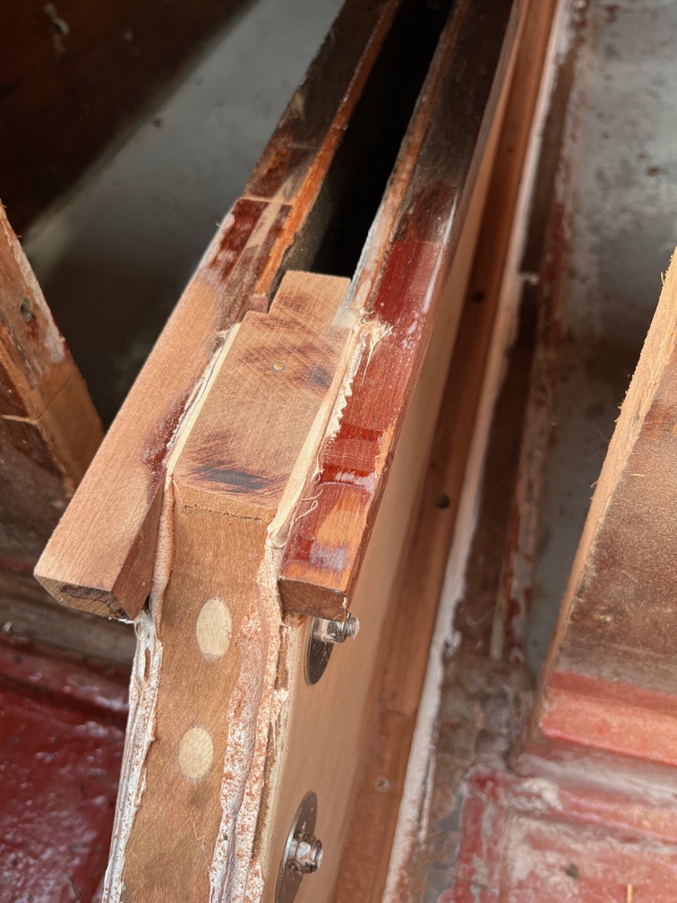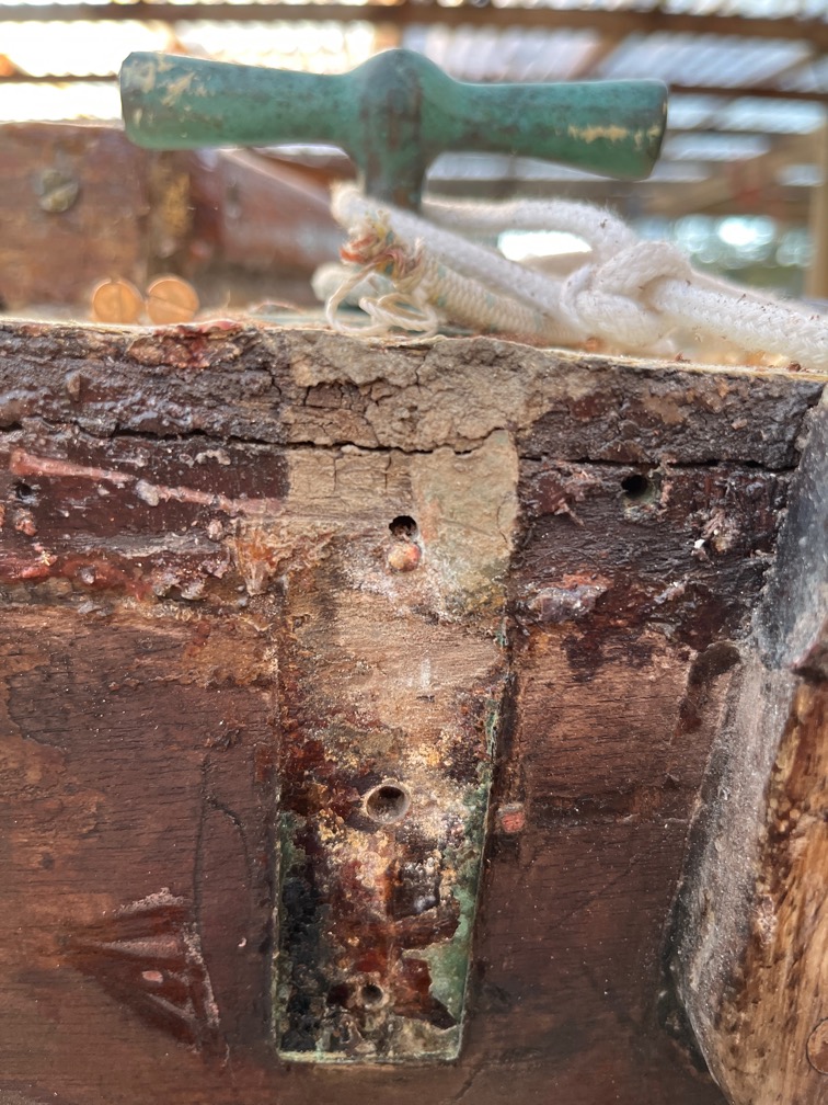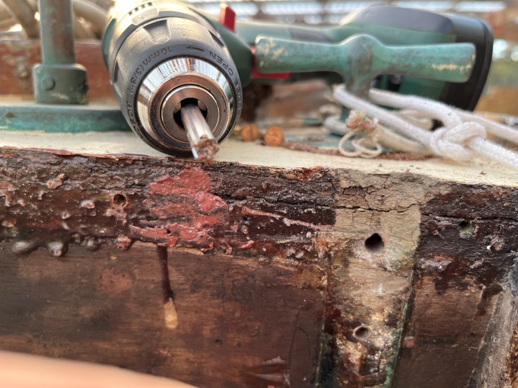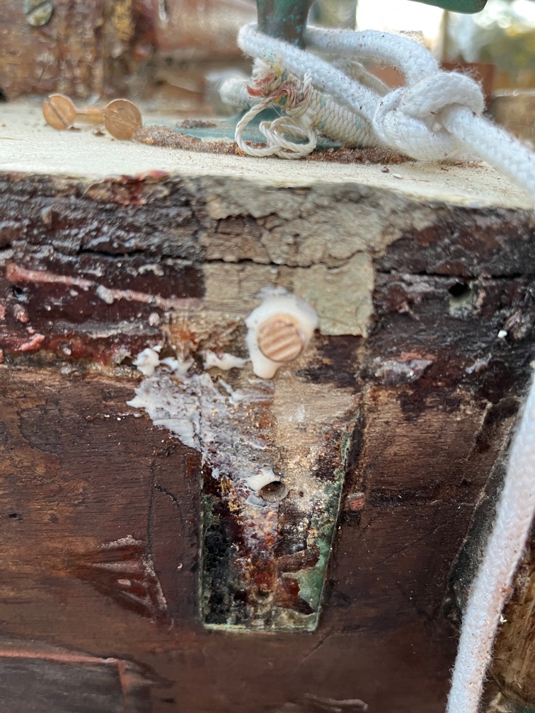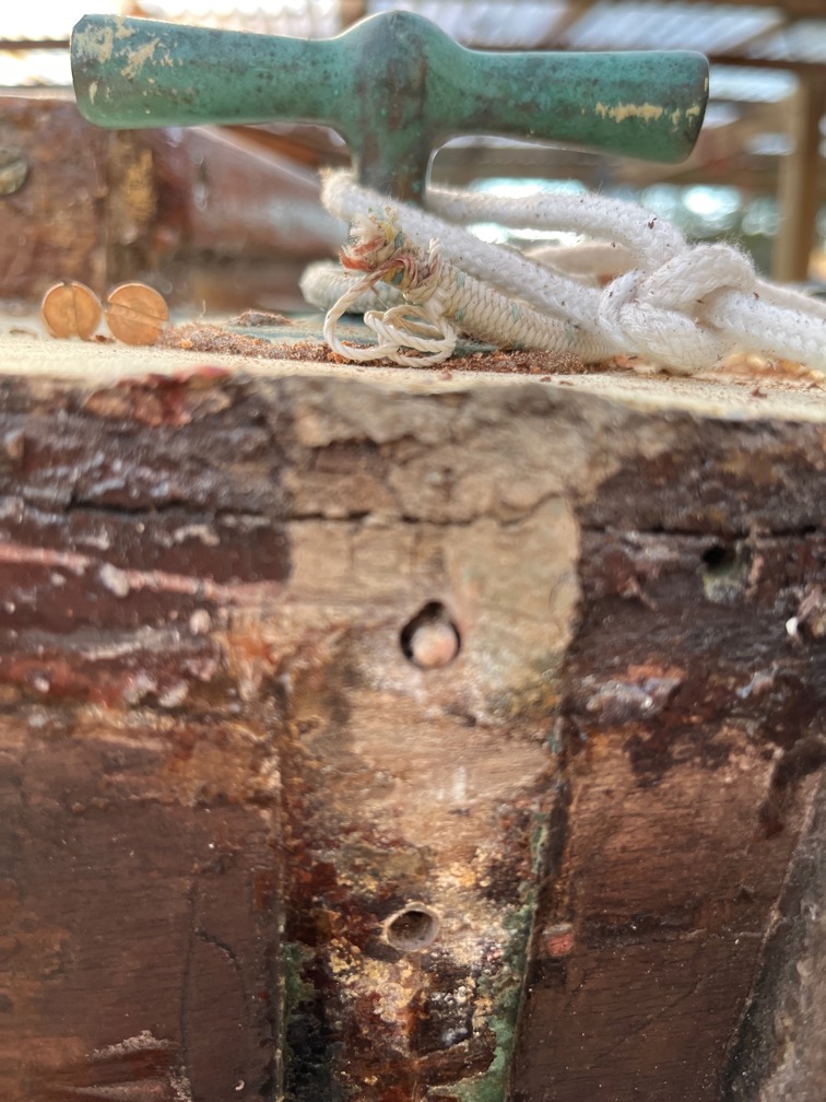 Then it was just a cse of opening up the hole and glueing in a dowel. Once the glue has fully dried I’ll cut off the end of the dowel flush with the transom and I will be in a position to mount the two bronze eyes and the rubbing strake.