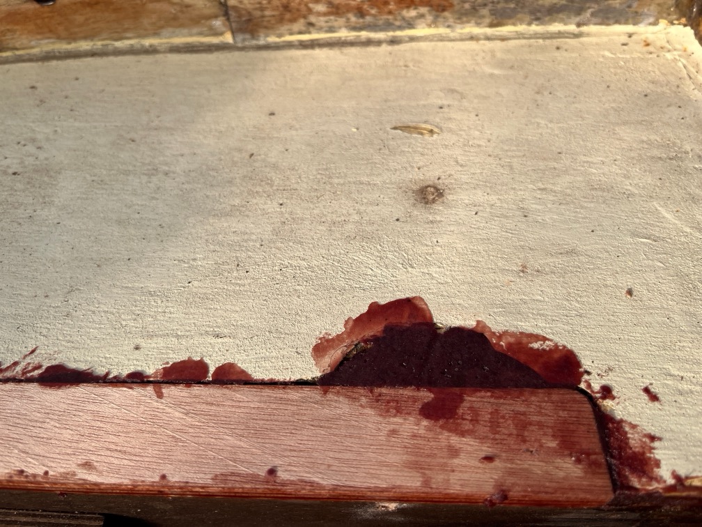 The major ding in the deck has filled well, but there are a few areas that need a little more epoxy to filling the parts where the epoxy has sagged down a little into the seams and left a void.
