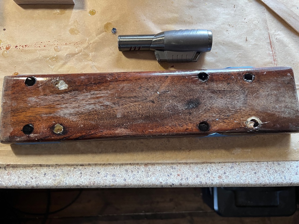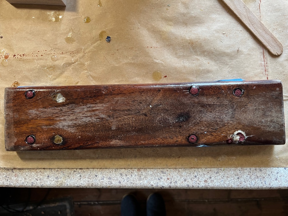I didn’t thicken the epoxy as I wanted it to run down into the holes. The disadvantage of doing this is that the bubbles you get when mixing the epoxy rise to the surface as you can see here.