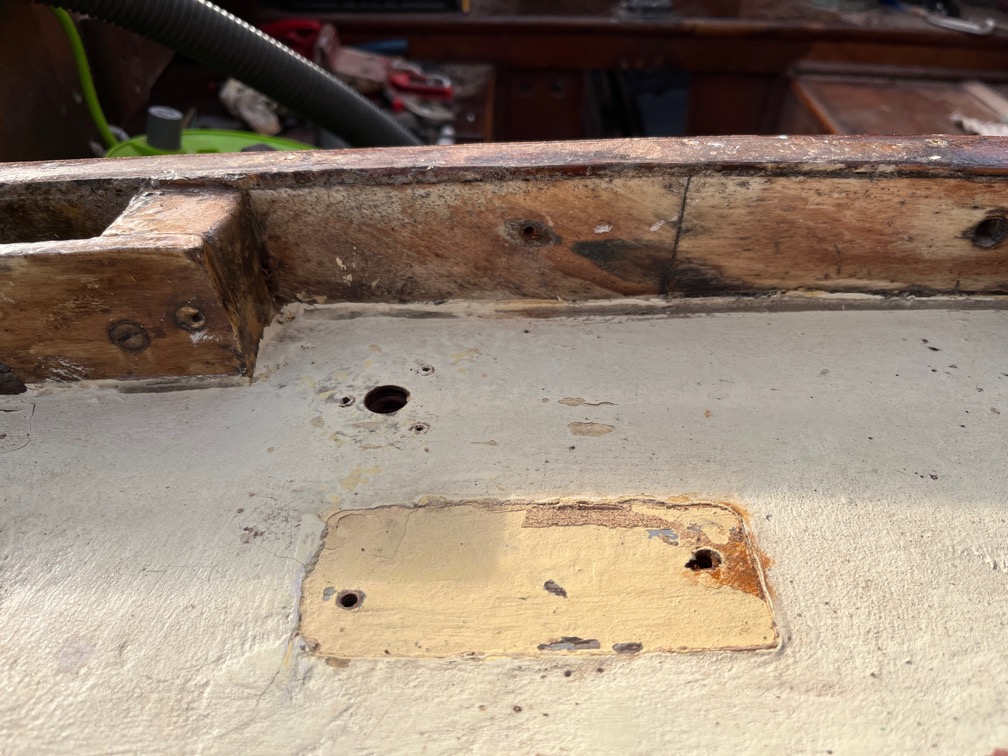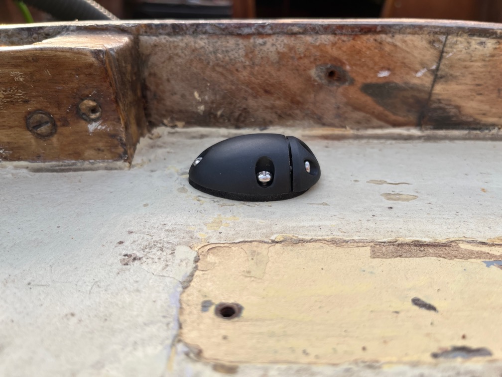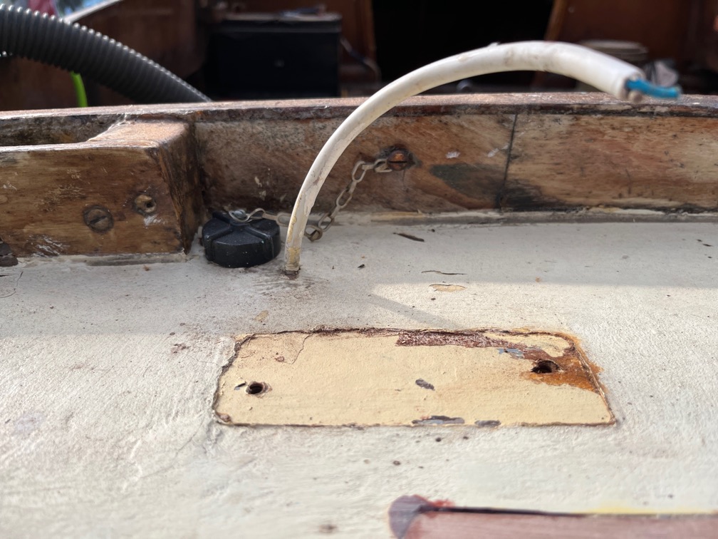 This is the place where the aft navigation light is mounted and I decided that I’d finish my tea break by cleaning the area up a little. The nav light used to have a through deck power fitting that was a socket in the deck and the plug on the end of the cable attached to the light. The deck fitting that was removed sometime ago, but the cap left behind, so that came off. The cable was pulled through from below, the hole drilled out to 14mm and the screw holes for the through deck fitting drilled.