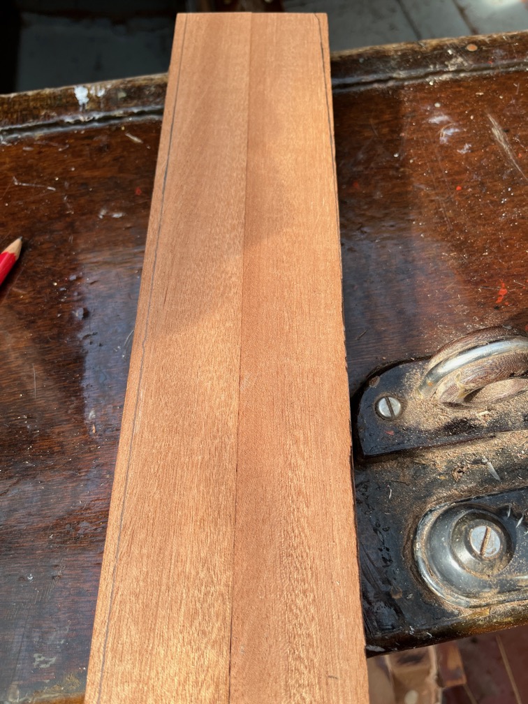 The piece of timber for the new top cover was placed into position after squaring off what will be the forward end and the shape of the underlying case drawn in pencil.