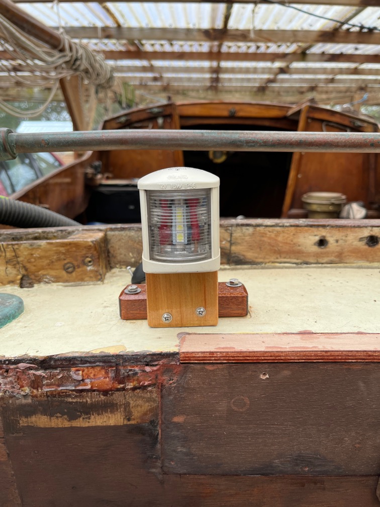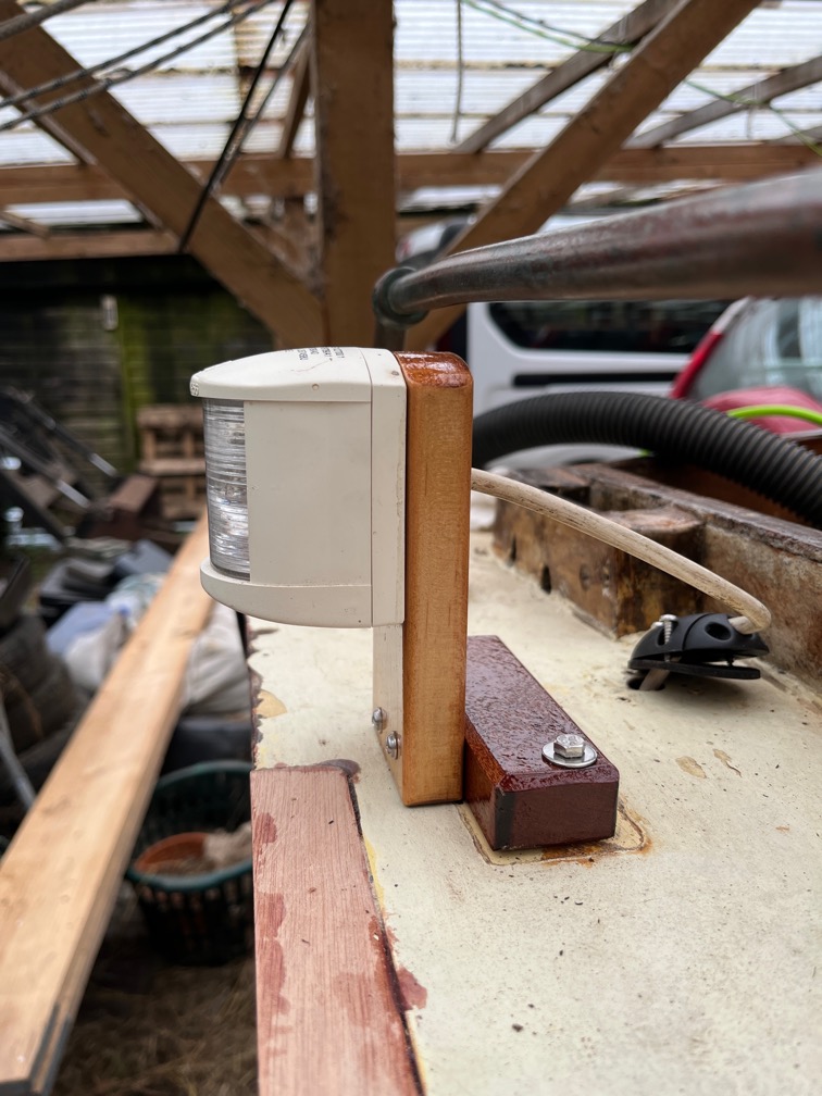During my next break I assembled the aft navigation light and mount. It is still not fitted finally, as I need to sand the deck and put on some new paint under the mount before it can be fitted properly.