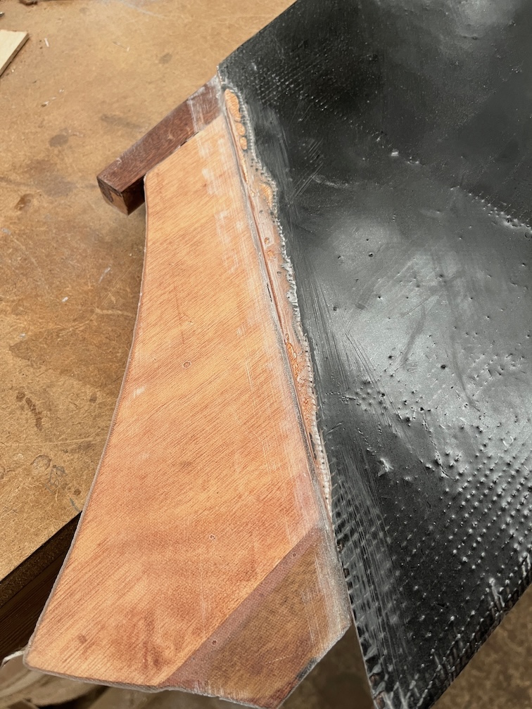 But I screwed up when putting the peel ply on the aft section here and it overlapped the inside face where it should not and I had to cut away the glass matt to get it all out. It’s not too much of a problem, I’ll just have to mix up some epoxy and patch the gap.
