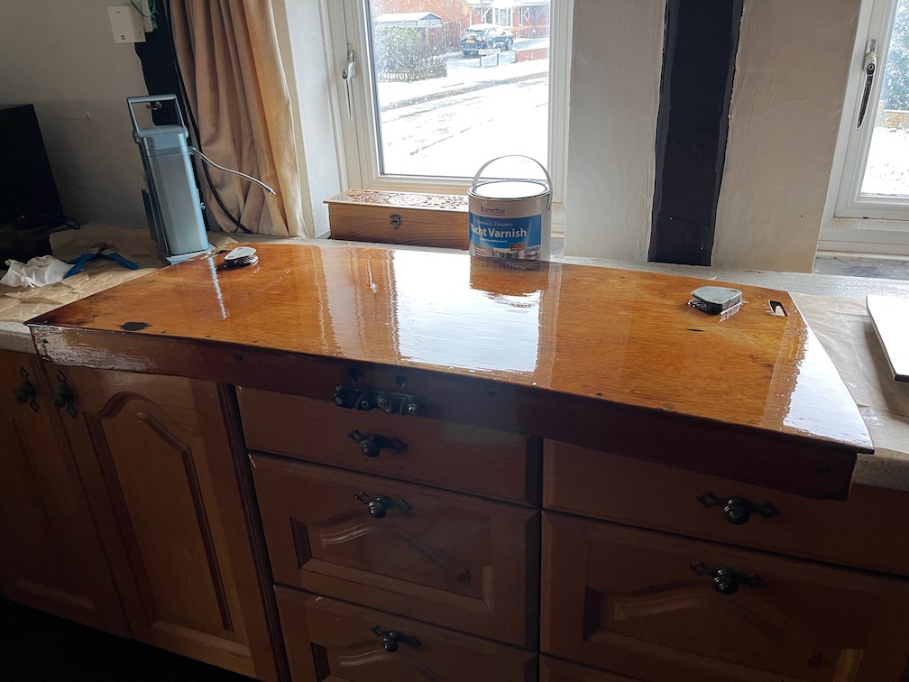 Since I have the poop deck removed I decided to continue the theme of getting ahead of the brightwork where possible and give it a coat or two. I was sanded in the workshop, brushed off and then brought into the workroom for its first coat of varnish. Being an outside piece of varnish it needed a good sanding but has come up nicely as a result. This might only need two coats. I might put more on, after all it is going to be out in all weathers when sailing and under a piece of canvas when on the mooring, so more coats of varnish will be better than less.